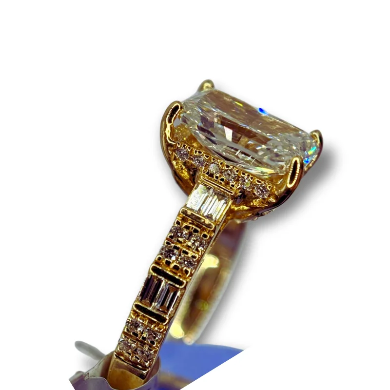A stunning radiant cut diamond ring set in a rich golden band with intricate detailing.